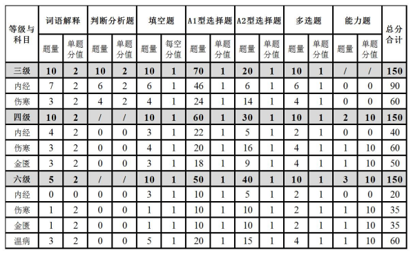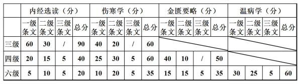 5.考试范围:三级涉及《黄帝内经》、《伤寒学》两个科目,主要考察一级条文;四级涉及《黄帝内经》、《伤寒学》、《金匮要略》三个科目,以一级和二级条文为主;六级考察《黄帝内经》、《伤寒学》、《金匮要略》、《温病学》四个科目,一、二、三级条文均会涉及。各等级学科及各级条文所占分值详见表1。