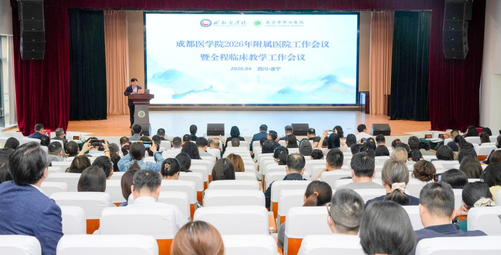 2026年4月10日,成都医学院2026年附属医院工作会暨全程临床教学工作会在遂宁市召开。会议围绕“医院改革与发展”主题,各附属医院交流了建设发展创新举措。围绕“推动临床教学同质化建设,提升医学人才培养质量”主题,总结了学校2025年临床教学工作,交流了临床教学先进经验,部署了临床教学同质化建设工作。会议由遂宁市中心医院承办,遂宁市卫生健康委员会、成都医学院、学校附属医院和临床教学基地的领导和教师代表等近200人参会。